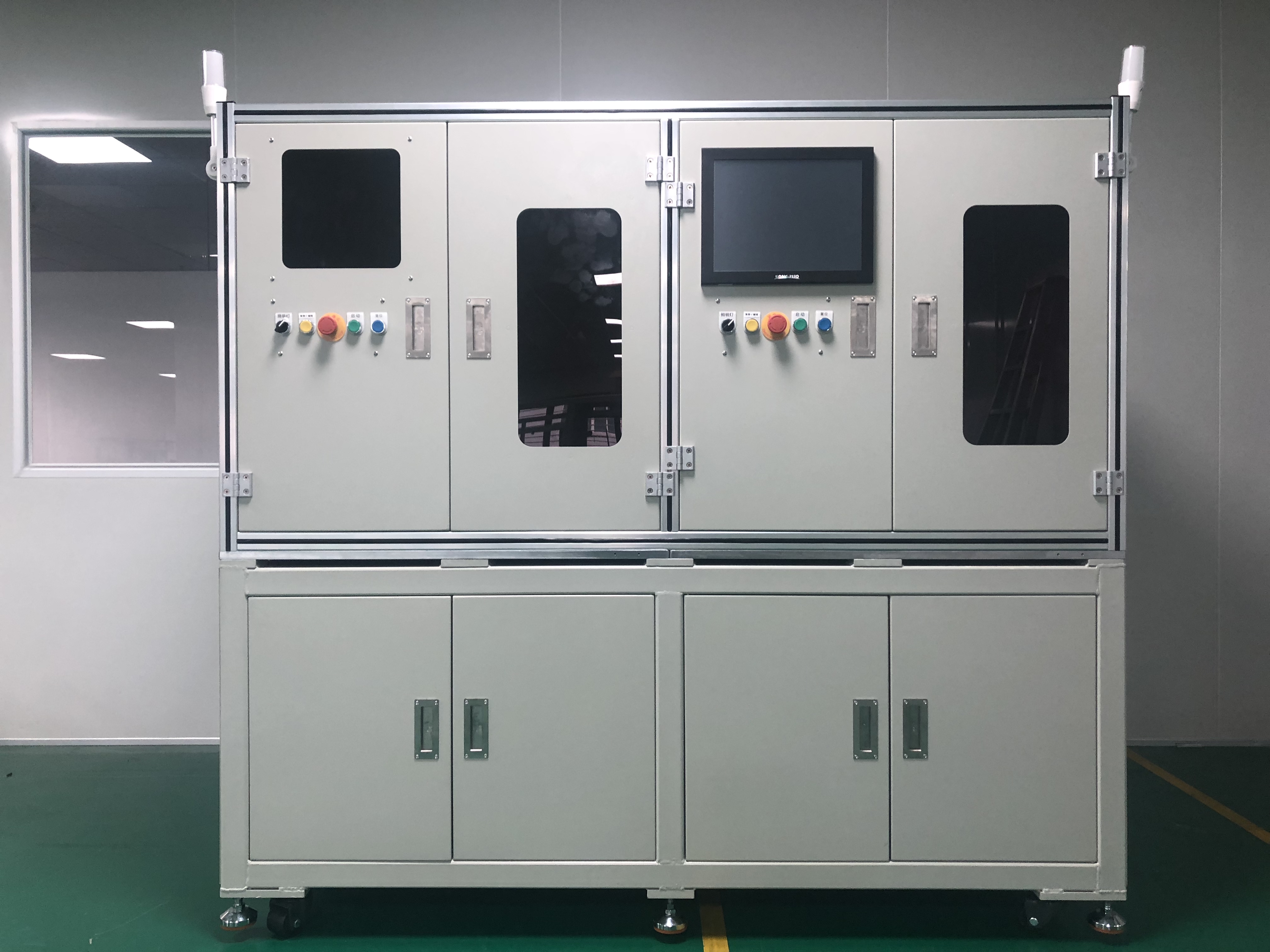 飞云公司自主研发的剪脚机,通过视觉定位和SCARA机器人的配合,实现TO自动识别脚位再自动剪脚;料盘载具方式人工上料;双工位同时运行,提高生产效率。